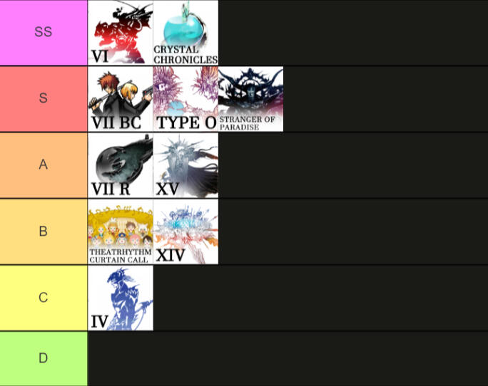Final Fantasy: 6, 7, 14, 15, Explorers, Crystal Chronicles, Stranger of Paradise, Type 0